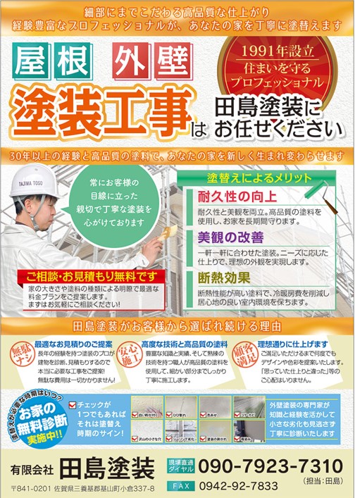 下記チラシにも記載していますが外壁に関するお悩みは田島塗装にお任せください。
